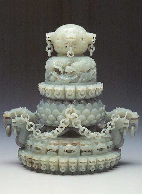 This magnificent jade incense burner is carved with many chains and heads of dragons and Haetae, each holding a magic pearl that can roll around within its mouth when the wind blows, from a single jade block, amazingly without gluing. Each part of the piece is so finely carved with the minutest of detail that one can hardly believe it was fashioned from one stone slab.
