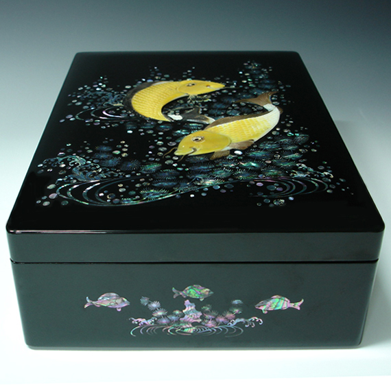 This unique lacquered wood document case is decorated with a mother of pearl design in which a pair of carp jumps out of the water in a dramatic pose. The details of the fish, including scales and fins as well as the foam, are captured in minute detail. A favorite subject for arts and crafts in Korea and China, carp symbolize the success in life; this representation comes from a Chinese legend in which the fish became a dragon as soon as it arrived at the head of the Yellow River in spring. In Korea, it is also a symbol of filial piety following a folk tale in which a son searches deep mountain valleys in the middle of winter to catch the fish for his aged mother.